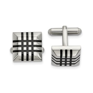 Classic elegance, perfect for every occasion! These polished square stainless-steel cuff links feature a black rubber striped and domed design with a bullet back toggle clasp. They are approximately 15mm (9/16 inch) in width by 15mm (9/16 inch) in length. Not suitable for engraving. Additional features include: crafted from stainless steel & black rubber; features a domed, striped design; approximate size is 15mm w x 15mm l; average weight for the pair is 17.2 grams.