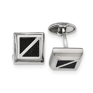 Look your best with these dynamic diagonal split cuff links rendered in polished stainless steel and black carbon fiber. The square top measures approximately 18mm (11/16 inch) in width by 18mm (11/16 inch) in length and is finished with a whale back closure. Additional features include: polished stainless steel, whale back style; diagonal split, black carbon fiber design; approximate size 18 x 18mm (11/16 inch); weight is approximately 36.65 grams.