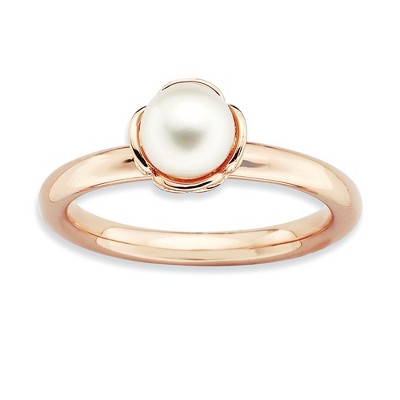 A beautiful 6.-6. Mm white freshwater cultured pearl is prominently set on this 2. Mm sterling silver band finished with 14k rose-gold plating. Guaranteed to fit together perfectly with all of the mix and match Stackable Expressions rings. Due to the nature of pearls, colors may not match what is shown. Gemstone treatment: bleached. Additional features include: 2.5mm, 14k rose gold plated sterling silver band; 6.0-6.5mm freshwater cultured pearl; wear it alone or featured in a collection; weight is approximately 3.33 grams.