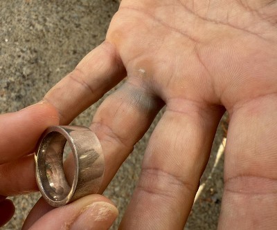 Within 1 day on September 13th(we got married) it turned my husbands finger green and the ring was tarnished and coating came off.