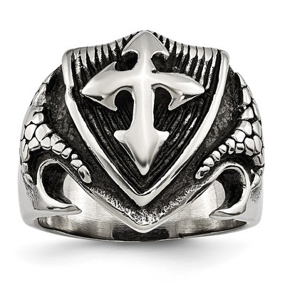 Unique Features - Big, Bold, and Impressive! Statement rings are trendier than ever and this one features an antiqued, polished, textured cross shield design with a tapered fit created from stainless steel and red enamel. The top width is approximately 19mm (3/4 inch). Available in whole sizes only 9-12.