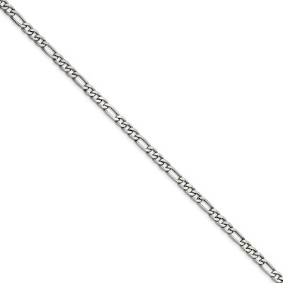 Round and oval links made of polished stainless steel, an inert metal that that will not rust or tarnish, interlock in a reoccurring three and one pattern that closes with a fancy lobster clasp. This seductive figaro chain looks great with dress or casual wear and the 7.3mm width is especially suited for the well-dressed man. Additional features include: crafted with stainless steel; 6.75 mm in width; figaro style chain; closes with a lobster claw clasp.
