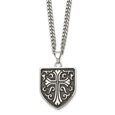 - Unique Features - Faith inspired fashion, this men's antiqued and polished stainless steel necklace features a Maltese cross in circle pendant that is approximately 31mm (1 1/4 inch) in width by 44mm (1 3/4 inch) in length, which includes the tapered bail. It hangs on a 2mm width by 22-inch long polished curb chain finished with a fancy lobster clasp.