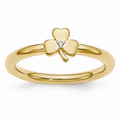 Create a look that is all your own with a fun assortment of rings that looks great alone or stacked in a collection to express your own unique style. This classic style clover ring fashioned from tarnish resistant rhodium plated sterling silver features a 6mm diamond accent clover atop a 2.5mm width band. The .05 carat round natural diamond is I2-I3 in clarity and H-I in color. Guaranteed to fit together perfectly with all of the mix and match Stackable Expressions rings. Additional features include: rhodium plated sterling silver; approximate clover size 6mm; band width 2.25mm; average item weight is 2.61 grams.