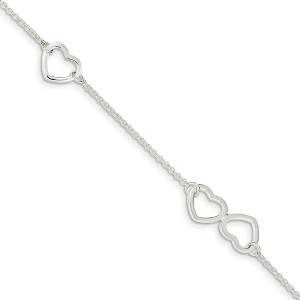 Make a summer fashion statement with this sterling silver bracelet that adds unexpected shimmer around your ankle. Polished 10 x 12mm open hearts connects a 1.5mm cable chain that measures 9 inches in length with a 1-inch extender and fancy lobster clasp. Additional features include: polished sterling silver design; 1.5mm cable chain with a fancy lobster clasp; features 10 x 12mm open heart charms; adjustable, 9 inches in length.
