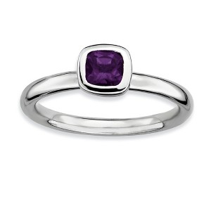 • Unique Features - Amethyst, February's birthstone is known as the stone of the mind, bringing calmness and clarity. This 2.5mm polished band fashioned from rhodium plated sterling silver is bezel set in a low profile mounting with a cushion cut gemstone that will add vibrant color to your finger. Guaranteed to fit together perfectly with all of the mix and match Stackable Expressions rings.
