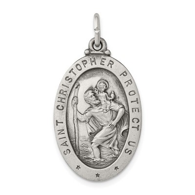 Celebrate and honor all special occasions with jewelry of religious significance! Our collection of spiritually inspired designs that show faith, hope and devotion are perfect for commemorating life's milestones. This St. Christopher (patron saint of travelers and motorists) pendant crafted in sterling silver features a solid, 2-dimensional, satin and antiqued design that is suitable. The approximate size is 16mm (5/8 inch) in width by 32mm (1 1/4 inch) in length with the bail. This item does not include a chain. Additional features include: crafted in sterling silver; features a solid, 2d, satin & antiqued design; approximate size is 16mm in width x 32mm in length; average weight is 2.74 grams.