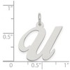 Indulge in a traditional initial charm that subtly enhances and personalizes your jewelry. Each fancy script letter is approximately 19mm (3/4 inch) in length, fashioned from sterling silver with a high polished finish and includes a standard jump ring. Made in the U.S.A. Chain not included. Additional features include: polished sterling silver; features a solid, thin flat design; approximate size 24mm wide x 19mm long; average weight is 0.70 grams.