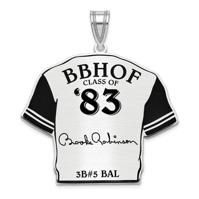 It is time to celebrate your favorite Hall of Fame baseball player, Gary Carter! We are a certified retailer and this authentic signature jersey pendant is officially licensed. It is created from rhodium plated sterling silver with black enamel and is approximately 39mm in width (1 1/2 inches or the size of a silver dollar). Brushed finish. Enamel colors may vary slightly. The color on your screen may also not reflect actual color due to variations in monitors and browsers. Chain not included. Made in the USA Additional features include: created from rhodium plated sterling silver & enamel; signature: gary carter; approximate size is 39mm wide (silver dollar) x 35mm length; average item weight is 6.6 grams.