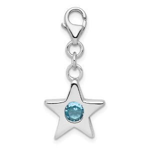 A luminous 13mm (1/2 Inch) star charm fashioned from sterling silver with a splash of color dangling from a fancy lobster-style clasp offers unlimited ways to accessorize. It is bezel set with a 4mm, dark blue cubic zirconia gemstone representing the month of September. Made in the U.S.A. Chain not included. Additional features include: polished sterling silver, open back design; bezel set with a 4mm dark blue cz stone; finished with a fancy lobster clasp; average weight is 1.74 grams.