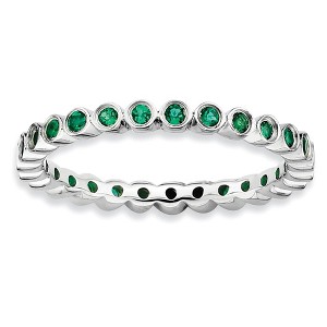 • Unique Features - Created Emerald, May's birthstone symbolizes luck, creativity and well-being bringing wisdom and reason. This 2.5mm wide band fashioned from rhodium plated sterling silver is bezel set with 1. Mm round synthetic gemstones all the way around. Guaranteed to fit together perfectly with all of the mix and match Stackable Expressions rings.