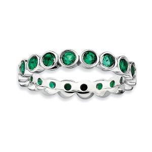 Created Emerald, May's birthstone symbolizes luck, creativity and well-being bringing wisdom and reason. This 3. Mm wide band fashioned from rhodium plated sterling silver is bezel set with 2. Mm round synthetic gemstones all the way around. Guaranteed to fit together perfectly with all of the mix and match Stackable Expressions rings. Additional features include: 3.5mm, rhodium-plated sterling silver band; bezel set with 2.5mm round created emerald stones; total gemstone weight for a size 7 is 1.04 carat; average item weight for a size 7 is 2.25 grams.