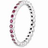 Created Ruby, July's birthstone is known as the stone of spiritual wisdom, health and knowledge bringing contentment and peace. This 2.5mm wide band fashioned from rhodium plated sterling silver is bezel set with 1. Mm round faceted gemstones all the way around. Created rubies like their natural counterparts can range from pink to deep red so please allow for variations in color. Guaranteed to fit together perfectly with all of the mix and match Stackable Expressions rings. Additional features include: crafted with rhodium plated sterling silver; bezel set with 1.5mm created ruby stones; total gemstone weight for a size 7 is .56 of a carat; average item weight is 1.44 grams.