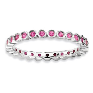 • Unique Features - Created Ruby, July's birthstone is known as the stone of spiritual wisdom, health and knowledge bringing contentment and peace. This 2.5mm wide band fashioned from rhodium plated sterling silver is bezel set with 1. Mm round faceted gemstones all the way around. Created rubies like their natural counterparts can range from pink to deep red so please allow for variations in color. Guaranteed to fit together perfectly with all of the mix and match Stackable Expressions rings.