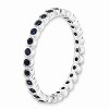 Created Sapphire, September's birthstone symbolizes truth, faithfulness and honesty bringing calmness and peace. This 2.5mm wide band fashioned from rhodium plated sterling silver is bezel set with 1. Mm round synthetic gemstones all the way around. Created sapphires like their natural counterparts can range from deepest midnight to brilliant cornflower blue so please allow for variations in color. Guaranteed to fit together perfectly with all of the mix and match Stackable Expressions rings. Additional features include: crafted with rhodium plated sterling silver; bezel set with 1.5mm created sapphire stones; total gemstone weight for a size 7 is .54 of a carat; average item weight for a size 7 is 1.44 grams.