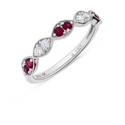 Ruby, the gemstone that brings red to vivid life is certain to draw attention. This triple stone interlocking stackable ring features octagon lab created rubies that are prong set atop a 2. Mm textured rhodium-plated sterling silver band. The synthetic gemstones are 4 x 3mm in size and the total carat weight is 0.1. Created rubies like their natural counterparts can range from pink to deep red so please allow for variations in color. Wear it alone or stacked next to other interlocking rings or plain bands to complete an easy elegant look. Additional features include: rhodium plated sterling silver; created rubies, 4 x 3mm octagon, 0.81 cttw; band width 2.5mm; average item weight is 2.88 grams.