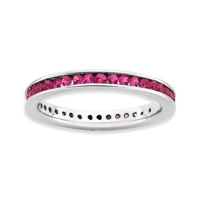 Created Ruby, July's birthstone is known as the stone of spiritual wisdom, health and knowledge bringing contentment and peace. This 3. Mm wide band fashioned from rhodium plated sterling silver is bezel set with 2. Mm round faceted gemstones all the way around. Created rubies like their natural counterparts can range from pink to deep red so please allow for variations in color. Guaranteed to fit together perfectly with all of the mix and match Stackable Expressions rings. Additional features include: 3.5mm, rhodium-plated sterling silver band; bezel set with 2.5mm created ruby stones; total gemstone weight for a size 7 is 1.5 carats; average item weight is 2.25 grams.
