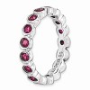 • Unique Features - Created Ruby, July's birthstone is known as the stone of spiritual wisdom, health and knowledge bringing contentment and peace. This 3. Mm wide band fashioned from rhodium plated sterling silver is bezel set with 2. Mm round faceted gemstones all the way around. Created rubies like their natural counterparts can range from pink to deep red so please allow for variations in color. Guaranteed to fit together perfectly with all of the mix and match Stackable Expressions rings.