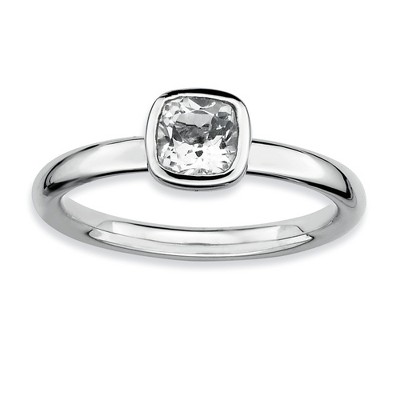 Make it simple and stylish with bands of different textures, finishes, widths and colors or extravagant with diamonds and gemstones! This stackable ring created from rhodium-plated .25 sterling silver features 2 princess-cut genuine white topaz stones totaling 1/2 carat. The approximate band width is 2. Mm and the ring top is approximate 4 x 6.5mm. The color range varies on all genuine gemstones so please allow for slight variations in shades (near colorless, may be very slightly yellow, grey, or blue). The color on your screen may also not reflect actual gemstone color due to variations in monitors. Guaranteed to fit together perfectly with all of the mix and match Stackable Expressions rings. Additional features include: rhodium plated sterling silver; features 2 princess-cut white topaz stones, 0.52 ctw; approximate band width 2.5mm, top size 4 x 6.75mm; average item weight for the size 7 is 3.21 grams.
