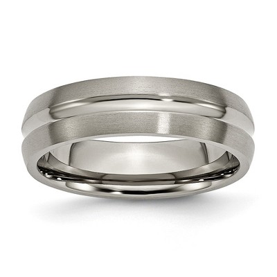 Substantial in size and character, our brushed titanium band features a bright, polished grooved center that is captivating in its simplicity. Titanium is hypoallergenic and this 10mm width band is designed with a standard fit shank. Available in whole and half sizes 8-14. Suitable for engraving. Additional features include: 10mm, standard fit band; titanium with a brushed and polished finish; available in whole and half sizes 8-14; hypoallergenic, perfect for those with sensitive skin.