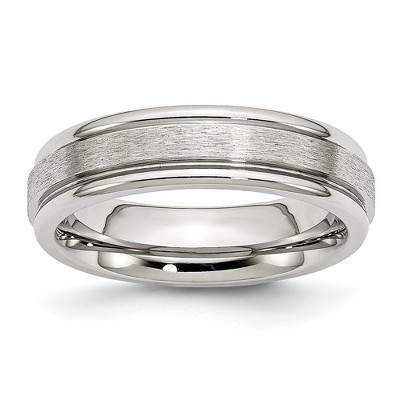The polished, grooved stripe on this brushed, titanium band combines a trendy look with a contemporary design. This domed, comfort fit band measures 6mm wide and is equally suited for either men or women. Available in whole and half sizes 6-13. Additional features include: titanium with a brushed and polished finish; 6mm, comfort fit, unisex band; available in whole and half sizes 6-13; hypoallergenic, perfect for those with sensitive skin.