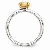 Featured atop a 2.5mm tarnish resistant rhodium-plated sterling silver band is a 5mm 0.5-carat cushion-cut genuine aquamarine bezel set in a yellow gold-tone plated low profile mounting. Color range varies on all natural stones so please allow for slight variations in shades (pale blue-green to nearly colorless). Guaranteed to fit together perfectly with all of the mix and match Stackable Expressions rings. Additional features include: rhodium plated sterling silver; gold-tone plated bezel, low profile mounting; cushion-cut heat treated aquamarine 0.55 carats; average item weight is 2.7 grams.