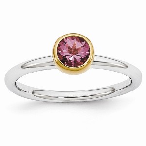 • Unique Features - Featured atop a 2.5mm tarnish resistant rhodium-plated sterling silver band is a 5mm 0.-carat round genuine pink tourmaline bezel set in a yellow gold-tone plated low profile mounting. Color range varies on all natural stones so please allow for slight variations in shades. Guaranteed to fit together perfectly with all of the mix and match Stackable Expressions rings.