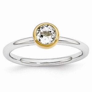 • Unique Features - Featured atop a 2.5mm tarnish resistant rhodium-plated sterling silver band is a 5mm 0.-carat round genuine white topaz bezel set in a yellow gold-tone plated low profile mounting. Color range varies on all natural stones so please allow for slight variations in shades. Guaranteed to fit together perfectly with all of the mix and match Stackable Expressions rings.