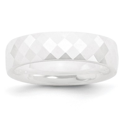 Combining the look and feel of porcelain with the strength and durability of Tungsten, Ceramic is the latest in high-tech, lightweight fashion material. Our 8mm faceted band features a comfort fit interior, a brilliant white color that will never fade and because it is also hypoallergenic, it is perfect for those with sensitive skin. Available in whole and half sizes 5-9. Additional features include: polished white ceramic; 8mm, comfort fit, domed band; scratch and fade resistant; hypoallergenic and maintenance free.