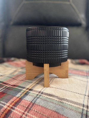 Black Ceramic Planter with Bamboo Wood Stand - Modern Ceramic Plant Pot for Indoor & Outdoor Use - Decorative Home & Garden Flower Pot - 5.5" Black
