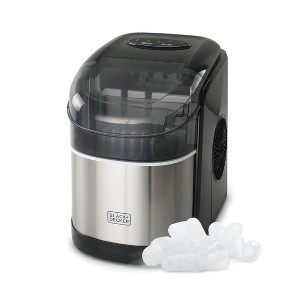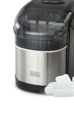 Our BLACK+DECKER portable ice maker is a perfect addition to any kitchen, bar area, office or home. This device (9.5" x 13.9" x 13) impressively produces up to 26 lbs. of ice every 24 hours or 9 cubes every 6-12 minutes. Weighing only 16.7 lbs., you can place your new electric ice maker on your countertop or anywhere thats convenient. This electric ice maker is equipped with intuitive LED indicator lights, water shortage indicator lights as well as an ice full indicator light. This ice machine has a storage capacity of 1.98 lbs., a water reservoir of 1.7L, and includes an ice basket and scoop. A drain plug on the bottom makes for easy access and the self-cleaning function helps keep your device spotless. Enjoy a choice of ice cube sizeseither large or small bullet shapes!