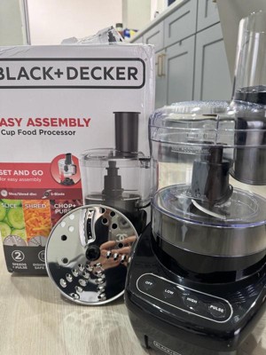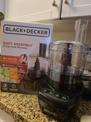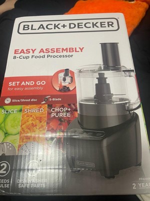 Just set and go for chopping, shredding, slicing, and more! The BLACK+DECKER Easy Assembly 8-Cup Food Processor is designed for convenience just set the work bowl onto the base and twist the lid until it locks into place. The S-blade is perfect for chopping and mixing, and the dual-sided disc delivers easy slicing and shredding. Choose from two speeds and a pulse setting to reach optimal results for all types of foods. The 8-cup work bowl accommodates large quantities, and all removable parts are dishwasher-safe so cleanup is fast and easy