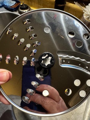 - REVERSIBLE SLICE/SHRED DISC:The reversible metal disc lets you slice veggies quickly or shred cheese without tiring your forearms.