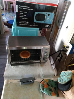 [This review was collected as part of a promotion.] I had bought a toaster oven and in it was just the right space for a pumpkin pie. There is plenty of room in my kitchen right next to a microwave with plenty of space in front and on the rear to avoid the high heat that might ruin the microwave. I read a pamphlet with these instructions for manually cleaning the pan and assorted asseries which led me to a cookbook, also inside of the pamphlet that came with this appliance. Idid follow instructions from turning the knobs to air frying won'tons without preheating and oven and for a reason. I learned with a pumpkin pie placed into the oven with an inch from the glass door. When ten minutes was up I took a hold of this with a pair of oven mitts and enjoyed pie