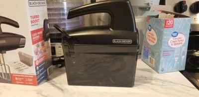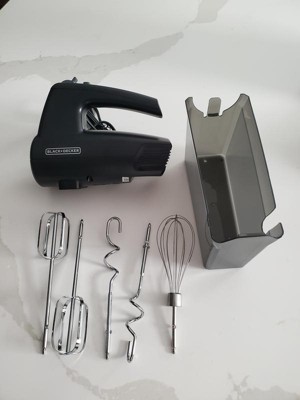[This review was collected as part of a promotion.] I got the BLACK+DECKER 5 Speed hand mixer in black and it's super easy to use. Comes with a couple of attachments and has a little storage container that the mixer fits into also. It's not very noisy. The only downfall I have with this is having to pull the attachments out instead of pressing a button and it kinda releases.