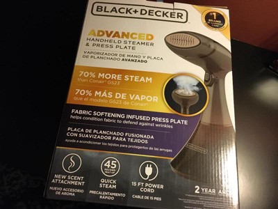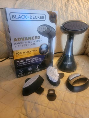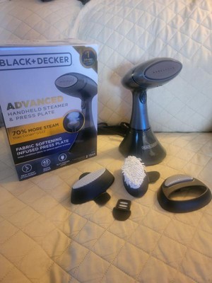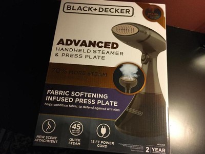 [This review was collected as part of a promotion.] I cant say enough good things about this Black and Decker Advanced Handheld Steamer and Press Plate. It has solved a lot of problems for me by being so efficent and convenient to use for taking out wrinkles on so many kinds of things. Its so much easier than setting up and ironing board and getting an iron ready to use and it works even better!! It only takes 45 seconds to heat up to full steam and has a really long cord so its easy to reach anywhere i need it to. I like to steam freshen the comforters on our beds and this makes it super easy to do it in addition to easily getting wrinkles out of our clothes with a strong blast of steam that works at any angle. I keep it plugged in and ready in my laundry room to use in a flash when i need to. It comes with attachments for removing lint, infusing scent and freshening upholstery. I like that i can choose between short burst of steam with the trigger or continuous steam. very easy to fill and use...i love it!!