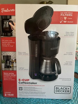 Delicious coffee, made easy! The BLACK+DECKER 5-Cup Coffeemaker gets going with the flip of a switch, quickly and efficiently heating water to the optimal temperature for full flavor extraction, ensuring a rich and satisfying brew. Coffee brews into the improved Duralife glass carafe, which is expertly engineered for comfortable handling and drip-free pouring