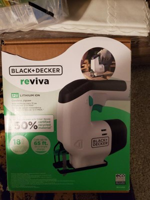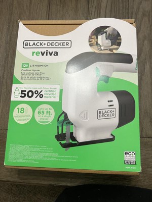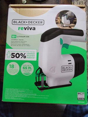 The Reviva 12V MAX Cordless Jigsaw's tool housing is made with Tritan Renew 50% certified recycled material in an amount equivalent to the weight of 18 Single-use 16.9 fl-oz. Plastic bottles. This lightweight jigsaw has an integrated battery and is built for ease of use to help you get the job done quickly. Look for the charging LED to turn off, which indicates a full charge, then quickly get started on basic and more complex repairs around the home. Whether you need to cut through metal, plastic, or wood, this jigsaw is durable enough to cut up to 65 ft. of 3/8 in. Plywood on a single charge. Its tool-free blade release lever makes switching blades seamless. With a variable speed trigger, you can use light pressure to start slowly and increase finger pressure as needed to precisely cut profiles, corners, and curves. This tool is suitable for woodworking, crafting, and household repairs.