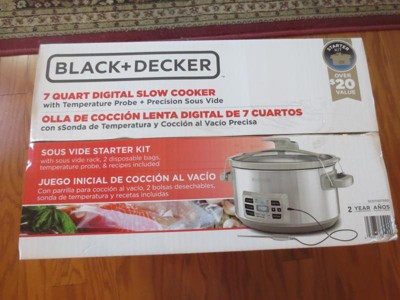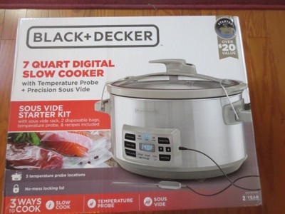 The BLACK+DECKER™ 7-Quart Digital Slow Cooker with Temperature Probe + Precision Sous-Vide gives you three ways to cook. 1.) Classic slow cooking is simple in the 7-quart stoneware crock. Just add in the ingredients and let the low, constant heat go to work on roasts, soups, chilis, and so much more! 2.) Use the temperature probe to achieve ideal results on a variety of proteins. Just set the desired temperature, insert the probe into the meat, and the slow cooker will do the rest. 3.) For restaurant-quality results without the hassle or guesswork, use the Sous-Vide Function. Just arrange single servings of food inside the resealable bags, set the time and temperature based on what you’re cooking and the level of doneness you prefer, and then insert the temperature probe into the water. The sous-vide method helps prevent overcooking by heating the water that surrounds the food, bringing it to the desired internal temperature. When slow cooking, three heat settings give you options to find the best temperature for your schedule—Low for 8-9 hours of cooking, High for 3-4 hours, and Warm for keeping food at the ideal serving temperature. Plus, cleanup is easy thanks to the dishwasher-safe stoneware pot and tempered glass lid.