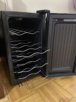 This phenomenal BLACK+DECKER thermoelectric wine cellar (10 x 20.4 x 24.9) stores up to 12 bottles of your favorite vino at just the right temperature. Preserve your wine so it will retain its delicious taste and nuanced flavors with our wine cooler (28.3 lbs.) that ranges in temperature from 46 to 66 Fahrenheit. Ideal for your favorite bottles, this thermoelectric cooling wine fridge is energy efficient with very low vibration. Our digital wine cooler comes with a solid mirrored door that blocks out any potential damaging UV light. Additionally, our wine cellar comes with 5 removable chrome full-length racks as well as a convenient interior light. This outstanding wine fridge also comes with adjustable leveling legs and a stylish recessed door handle. ISTA-6A packaging included for quality delivery.