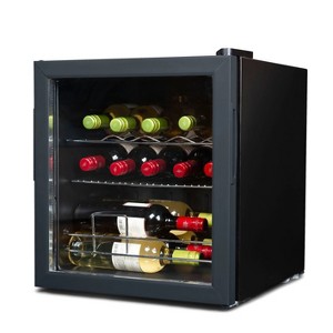 This BLACK+DECKER 14 bottle wine fridge and wine refrigerator with shelves keeps all your favorite reds, whites, ross, sparkling wines, and champagnes at the perfect temperature with its compressor cooling system. Retrieve a delicious bottle of white wine from our wine storage cooler to savor after a long day, weekend and when entertaining friends. When it comes to wine coolers for home and top-tier beverage refrigerators, this freestanding 14 bottle compressor wine cooler has dimensions of 17.5" x 18.6" x 19.6", weighs 36.4 Ibs., and has a space-saving flat back design that would fit anywhere convenient such as the kitchen, basement, wine cabinet, home office and more. This wine mini refrigerator and white wine chiller is one of the top picks for quality wine accessories! Included in this wine storage fridge is a recessed door handle, 1 chrome full-width wine rack, 1 chrome full-width flat shelf and 1 chrome bottom compartment rack to prevent rolling. Our wine chiller and wine storage refrigerator includes clear double pane glass doors to maintain optimal cooling with a stylish black cabinet and grey door trim with minimal vibration, which is ideal for long-term storage. This electric wine chiller includes a mechanical temperature control within the range of 40F - 64F. Make this BLACK+DECKER wine fridge a permanent indoor fixture and enjoy a glass of vino from the comfort of home whenever you please. This wine cooler uses environmentally friendly R600A refrigerant.