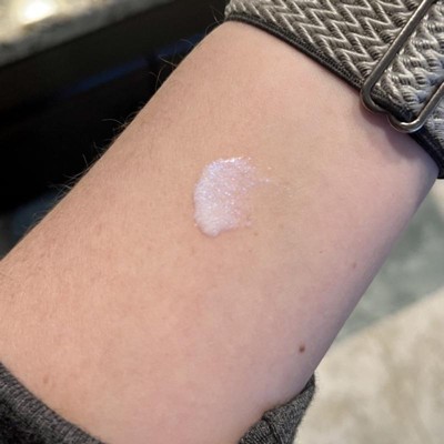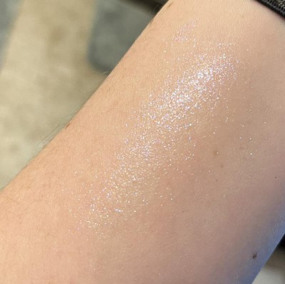This is a glitter product not a shimmer/highlighter. Smells like paint personally would prefer no smell at all… its more on the blue end