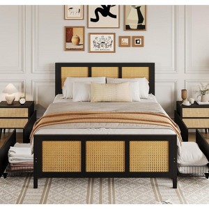 Black Rattan Bed Frame with Headboard,Boho Cane Platform Full Size Bed Frame with 4 Drawers