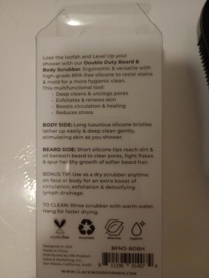 Upgrade your body & beard with the ultimate men's shower tool. Our Double Duty Beard & Body Scrubber has long, soothing bristles on one side that hold lather longer, while still helping to deep clean & exfoliate the skin. Shorter thicker tips get beneath beard hairs to clear pores & boost healthy growth. Helps prevent acne breakouts under the beard & bacne breakouts on body. Also aids detoxification through lymphatic drainage & just plain feels good. Made to last with premium food-grade silicone that is stain & bacteria resistant. So it's more hygienic & more sustainable than loofahs that need replacing when they get worn & dirty. Lose the Loofah & level up your grooming game with this essential wellness tool!