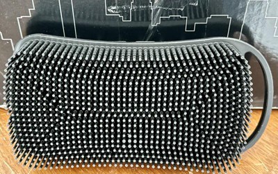 It's small, fits nicely into your hand. It has a rubbery grippy feel so it doesn't slide out of your hand when you're using it. It's very flexible. One side has long bristles, that's for scrubbing your body. These bristles are soft and flexible, and they do a great job exfoliating your skin. The opposite side has shorter, more firm (but still a little soft & flexible) for penetrating into your beard to reach the skin underneath. This side is terrific for scalp massage as well. There's a handle on it to hang it up to dry after using it. It's a nice dual sided, multi purpose body scrubber. My skin feels super clean and smooth after using it. I like it a lot!