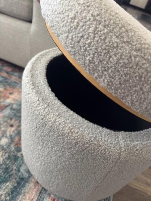 This has a great weight and sturdiness to it, which I really appreciate. It’s substantial enough for a toddler to climb up on and not fall over, or knock the top off. The material is less soft than I was expecting, but seems like it will be more durable. It almost feels like a wool rug, as opposed to a soft fluffy Sherpa. Not a deal breaker at all, since it will just be used as a foot rest. Great storage, and love the cream color, it’s not too stark and will mesh in any room.