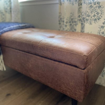 I love this coffee table ottoman. Gorgeous faux leather, buttery soft. Color is perfect, just like the photo. Great amount of storage, easily opens. Perfect size (large) and height. Highly recommend!