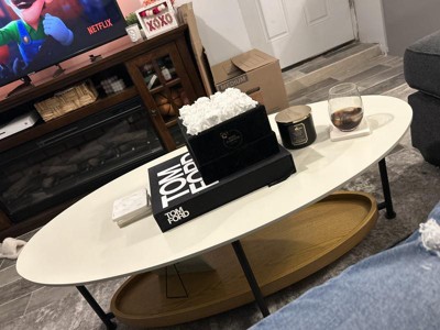 [This review was collected as part of a promotion.] I was looking for something simple but still visually interesting, and this one caught my eye with the white and wood combo—it has a clean, modern feel without being too sterile. The oval shape softens the room nicely and works especially well in smaller spaces. Assembly was super easy (which I appreciated because I’m not exactly handy). It only took me about 15 minutes, no issues at all. It’s really solid too. The top shelf can hold up to 100 lbs, and the bottom up to 50, which is more than enough for anything I’d put on a coffee table—books, plants, trays, you name it. The two layers are actually super practical—top for everyday stuff, bottom for storage or decor. It’s sturdy, easy to clean, and just looks really good without trying too hard. Honestly, it pulls the whole living room together. Definitely recommend!