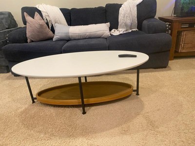 - Modern 2-tier oval coffee table with storage shelf adds style and functionality to living rooms