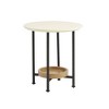 Modernize your living room decor with the Blandford End Table. Flaunting an eye-catching design, this oval end table features a light table top with black metal legs that create a bold contemporary look. A lower natural shelf provides space to display and store your magazines and other essentials. Assembly is required and tools are included.